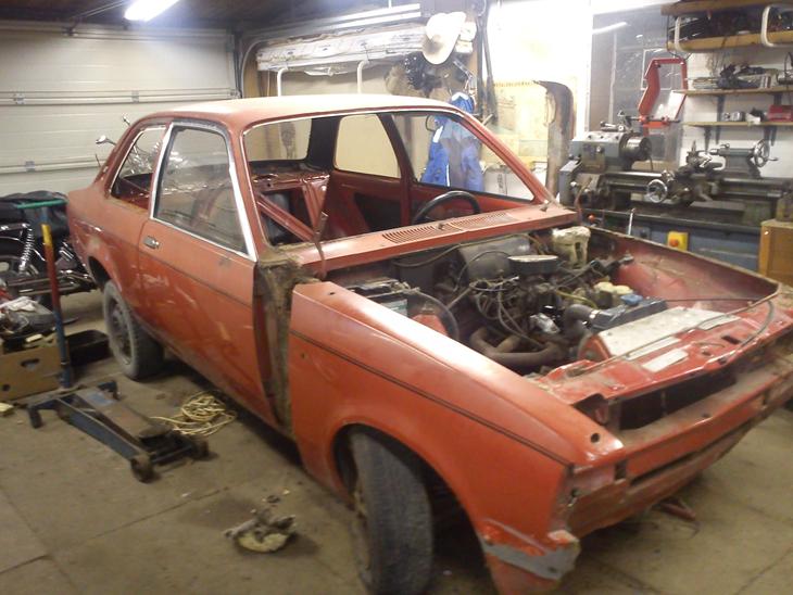 Har desværre ingen billeder inden jeg skildte den helt af, men sådan står den pt. Der er rimelig meget rust der skal laves. Alt bliver taget ud af bilen så den kan laves 110% iorden, og lakeres overalt bagefter. Motoren er blevet nusset lidt for.