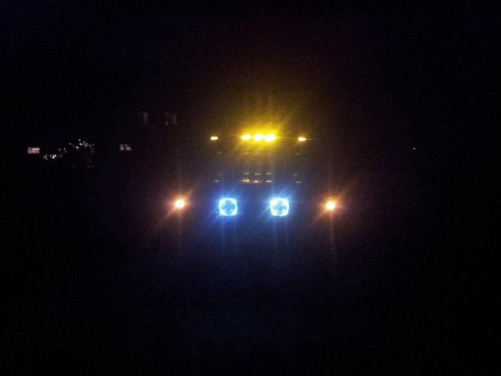 og en masse arbejds lygter og en lysbro på taget og noget ekstra lys bag ud med noget orange blink også