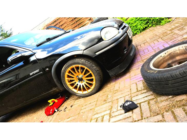 Fælgene er købt brugt og derefter ordnet og lakeret i guld med blå bolte.